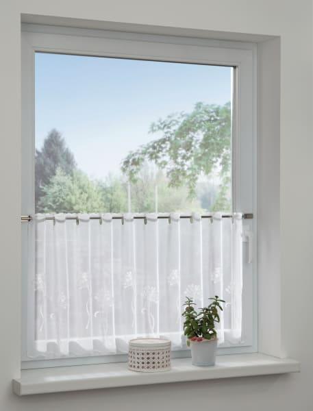 Der leichte Stoff der weißen Bistrogardine mit seiner floralen Stickerei in weiß, umspielt gekonnt ihr Fenster. Die Gardine ist transparent und bringt so eine gewisse Leichtigkeit in Ihre Räume. Mit der Bistrogardine schaffen Sie einen Hauch Privatsphäre und steigern das wohnliche Ambiente ohne Ihren Räumen das Licht zu nehmen oder das Fenster vollständig abzudecken.