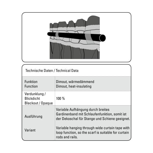Der Dimout Schal mit Gardinenband ist ein schönes Gestaltungselement mit Verdunklungsfunktion. Es schützt vor ungewollten Blicken und Sonnenlicht. Die weichen Wellen des Stoffes sorgen für eine wohnliche Atmosphäre und Gemütlichkeit.