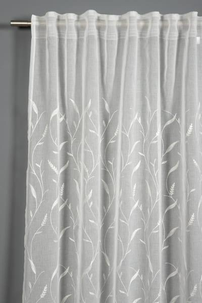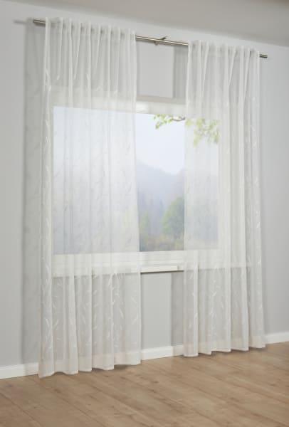 Der Schal Dolly-Voile in der Farbe natur wirkt mit seiner floralen Stickerei im selben Farbton sehr natürlich. Das Gardinenband mit verdeckter Schlaufe macht die Befestigung elegant und einfach zugleich.