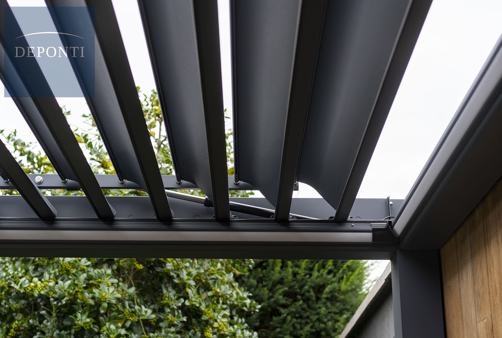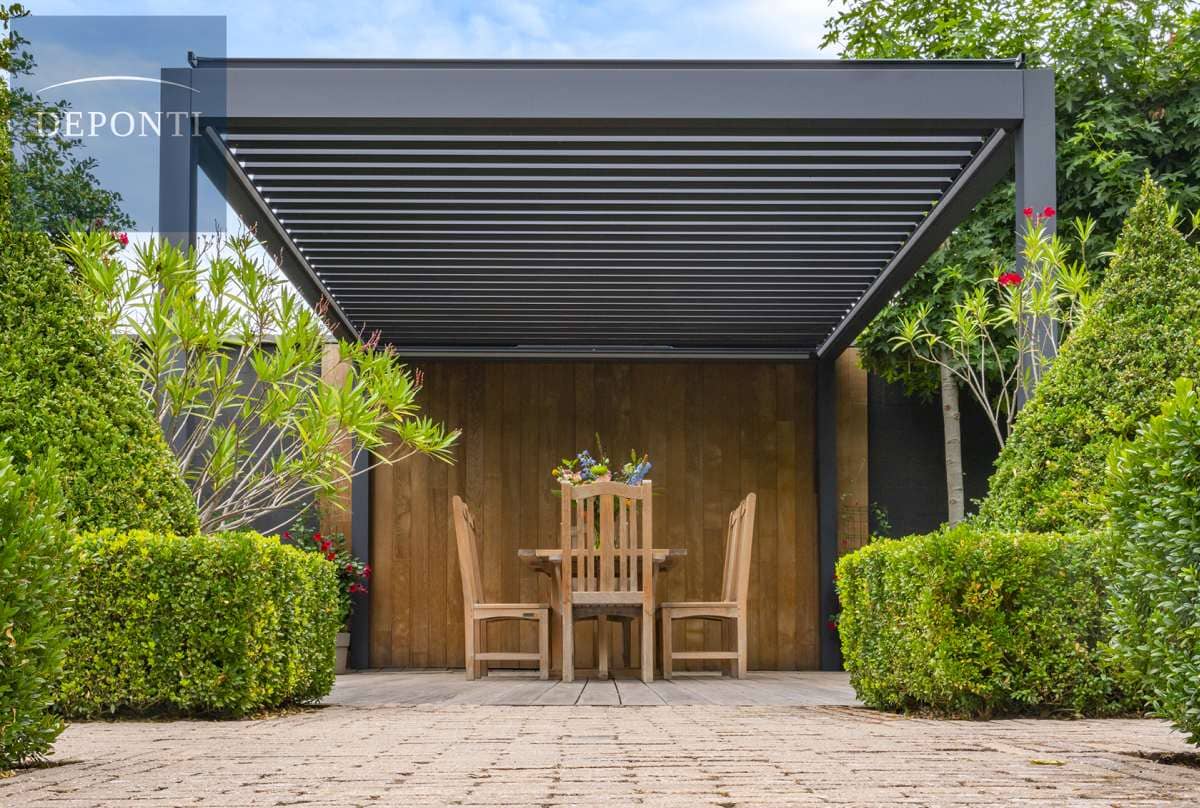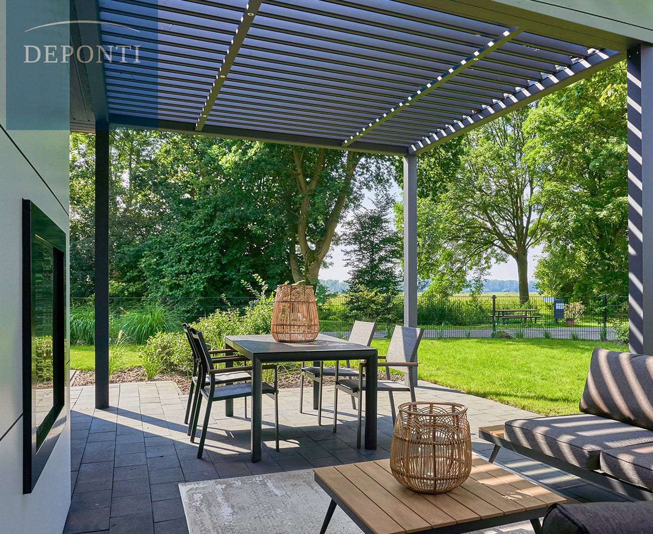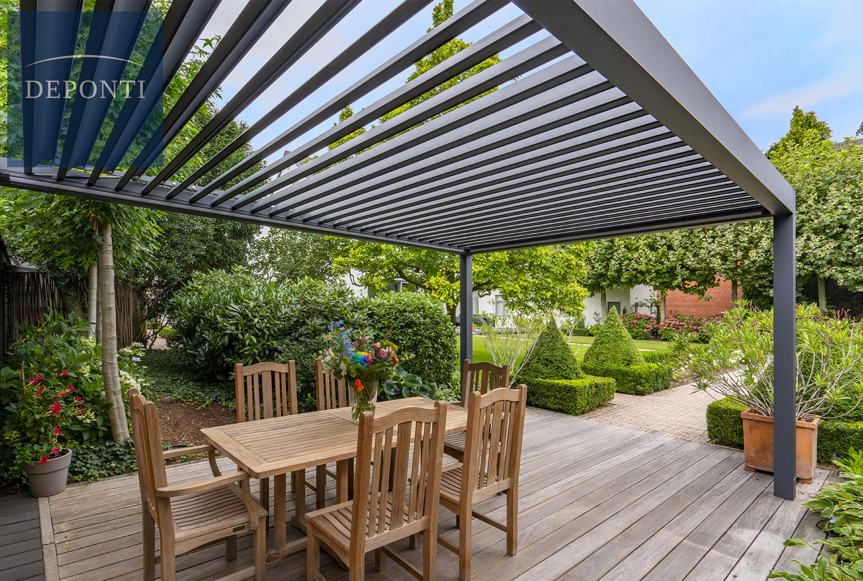 Mit dem Pinela Lamellendach von Deponti können Sie zu jederzeit wetterunabhängig Ihre Terrasse genießen. Der eingebaute Somfy Motor und die optional erhältliche LED Beleuchtung werden über die beiliegende Fenbedienung gesteuert. Per Knopfdruck können Sie auf einfachste Weise Licht- und Schatteneinfall ebenso wie den Luftstrom unter Ihrem Lamellendach regeln.
