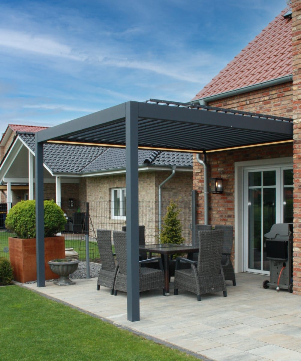 Im Sommer verhindert die Pinela heiße Luft unter dem Lamellendach, während es im Winter vor kalten, regnerischen Bedingungen schützt. Die Pinela überzeugt jedoch nicht nur mit optimalem Nutzerkomfort. Mit ihrem hochwertigen, modernen Design wertet sie die Terrasse optisch auf.