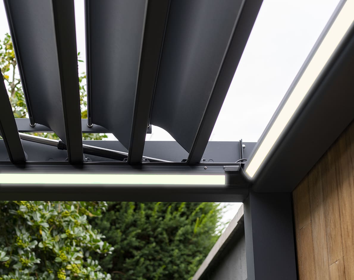 Per Fernbedienung können die Aluminiumlamellen im Dach nach Belieben in die gewünschte Position gedreht werden. Dadurch können Sie die Lamellen der Sonne entsprechend rotieren. Das Lamellendach der Pinela lässt sich stufenlos bis zu 120 Grad verstellen.